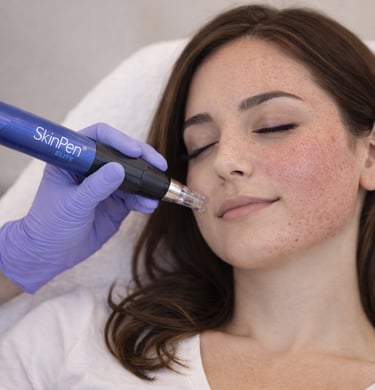 Now that the numbing cream has completely taken hold, we’ll move into microneedling. Our advanced medical device the Skin Pen Elite uses very fine needles to make tiny, controlled punctures without dragging or scratchign the skin's surface; this gentle process signals your skin to ramp up collagen and healing for beautifully rejuvenated results.
